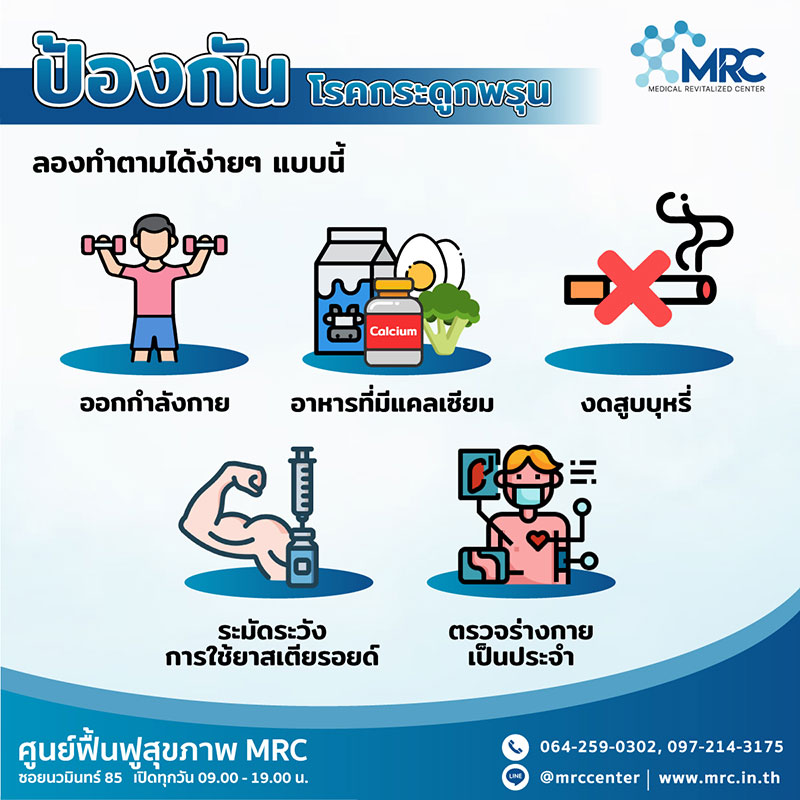 • ตรวจร่างกายเป็นประจำ โดยเฉพาะในวัยเกิน 50 ปี ควรเข้ารับเข้าตรวจวัดกระดูกเพื่อป้องกันการเสื่อมแต่เนิ่นๆ