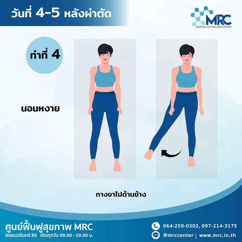 ออกกำลังกายกล้ามเนื้อต้นขา นอนราบเกร็งกล้ามเนื้อเข่า และกดเข่าลงบนที่นอนให้มากที่สุด กระดกข้อเท้าขึ้น นับ 1 - 10 จึงปล่อยกล้ามเนื้อคลายตัว ทำวันละ 3 เซท เซทละ 15 - 20 ครั้ง