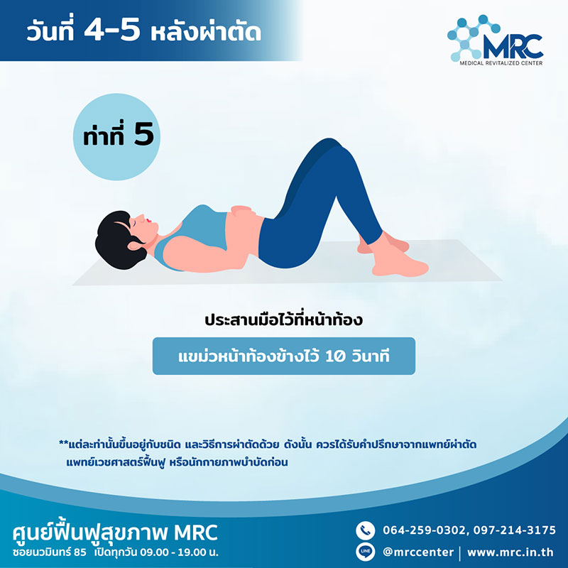นอนหงายชันเข่า 2 ข้าง แขนแนบลำตัว เกร็งกล้ามเนื้อท้อง กดหลังกับพื้นเตียง เกร็งนาน 5 วินาที พัก และทำติดต่อกัน 10 ครั้ง