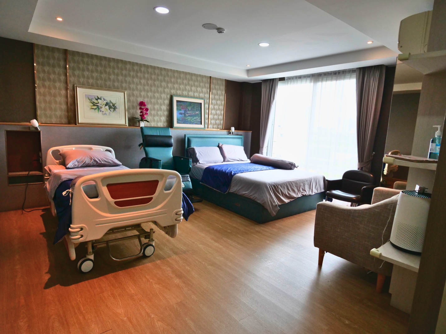 สิ่งอำนวยความสะดวก: เตียงสำหรับคนไข้, เตียง 3.5 ฟุต สำหรับญาติหรือผู้ดูแล, ตู้เสื้อผ้า, TV 40”, ไมโครเวฟ, ตู้เย็น, แพนทรี่เตรียมอาหาร, ชุดโต๊ะ–เก้าอี้สำหรับทานอาหาร 2 ที่นั่ง, กาน้ำร้อน, เครื่องฟอกอากาศ
